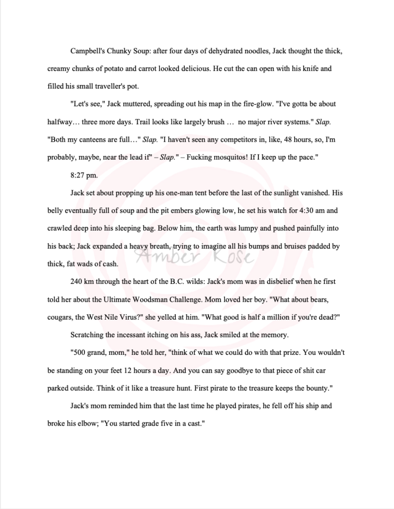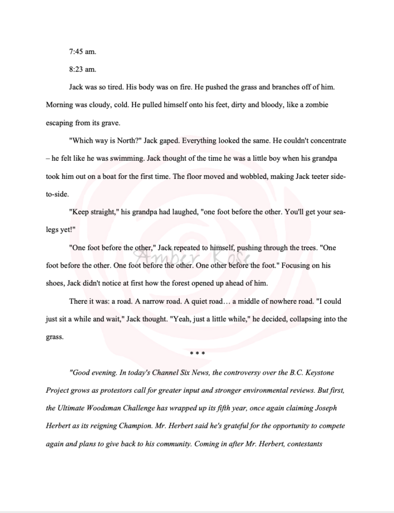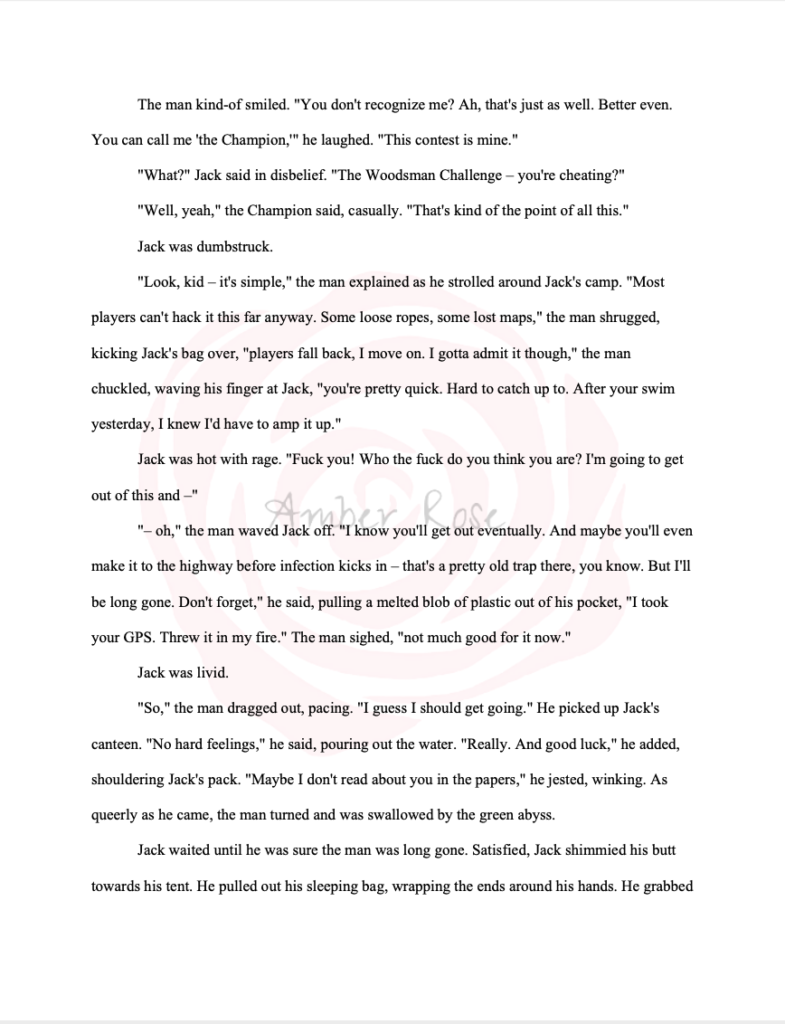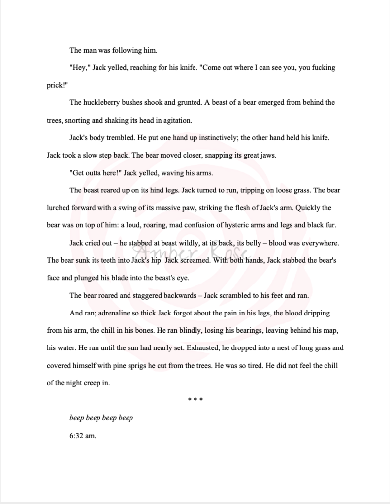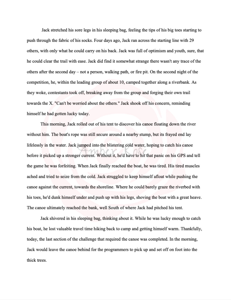 After the writer’s story is submitted to the contest, the writers are free to continue editing, developing, or changing their story as they see fit. However, I like to share my contest-pieces as-is. I find it interesting to see what has developed in the short time frame, without the benefit of time: being able to step away, clear your head, and edit/proofread with fresh eyes and perspective.